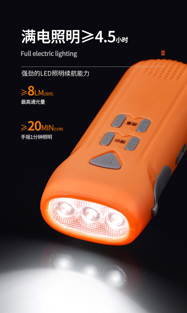 手電筒的高亮度LED燈珠,能瞬間照亮大片區(qū)域,多種照明模式可靈活切換。內(nèi)置的FM收音機(jī),讓您及時(shí)獲取外界信息。手搖發(fā)電功能,讓您只需搖動(dòng)手柄幾分鐘,就能獲得數(shù)小時(shí)照明。USB充電接口,還能為手機(jī)等設(shè)備充電,確保通訊暢通。