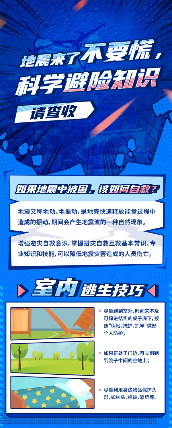 室外避險:如果你在室外,要盡量遠離建筑物、廣告牌、路燈等可能倒塌的物體。尋找開闊的空地,蹲下或趴下,用手保護頭部,避免被掉落的物品砸傷。